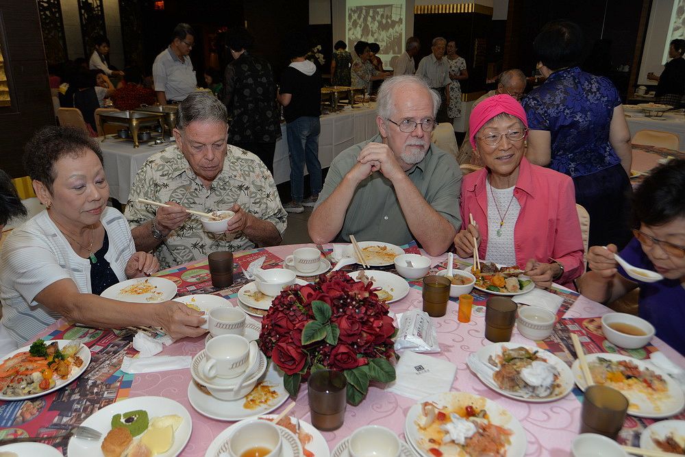 【雄商21屆畢業50週年同學會】 2018.10.14上午11時在華王大飯店2F華宮廳盛大舉行,全屆一至八班,參加人數高達132人,盛況空前。並邀請當年的師長蘇清緞老師(93歲高齡)、校友會理事長林慧瑾、 三位榮譽理事長:鐘棋楠老師、謝平老師、林高生學長參加,同學會在林知鴻同學上台問候聲中揭開序幕,首先介紹與會的貴賓;並邀請校友會理事長林慧瑾上台致詞。 全體與會同學中有多位50年未曾見面,也有多位定居國外特地返國參加,其中有兩位還攜手外國夫婿前來參加,其他從北部、中部等別縣市都由四面八方聚集出席此盛會。全體與會同學多年不見,大家熱血沸騰 ,熱情寒暄,整個會場熱鬧滾滾,從開始「嗨」到結束。歡樂的氣氛描繪在每位同學的臉上,其興奮的心情,不在現場參與,以筆墨是無法形容。 |