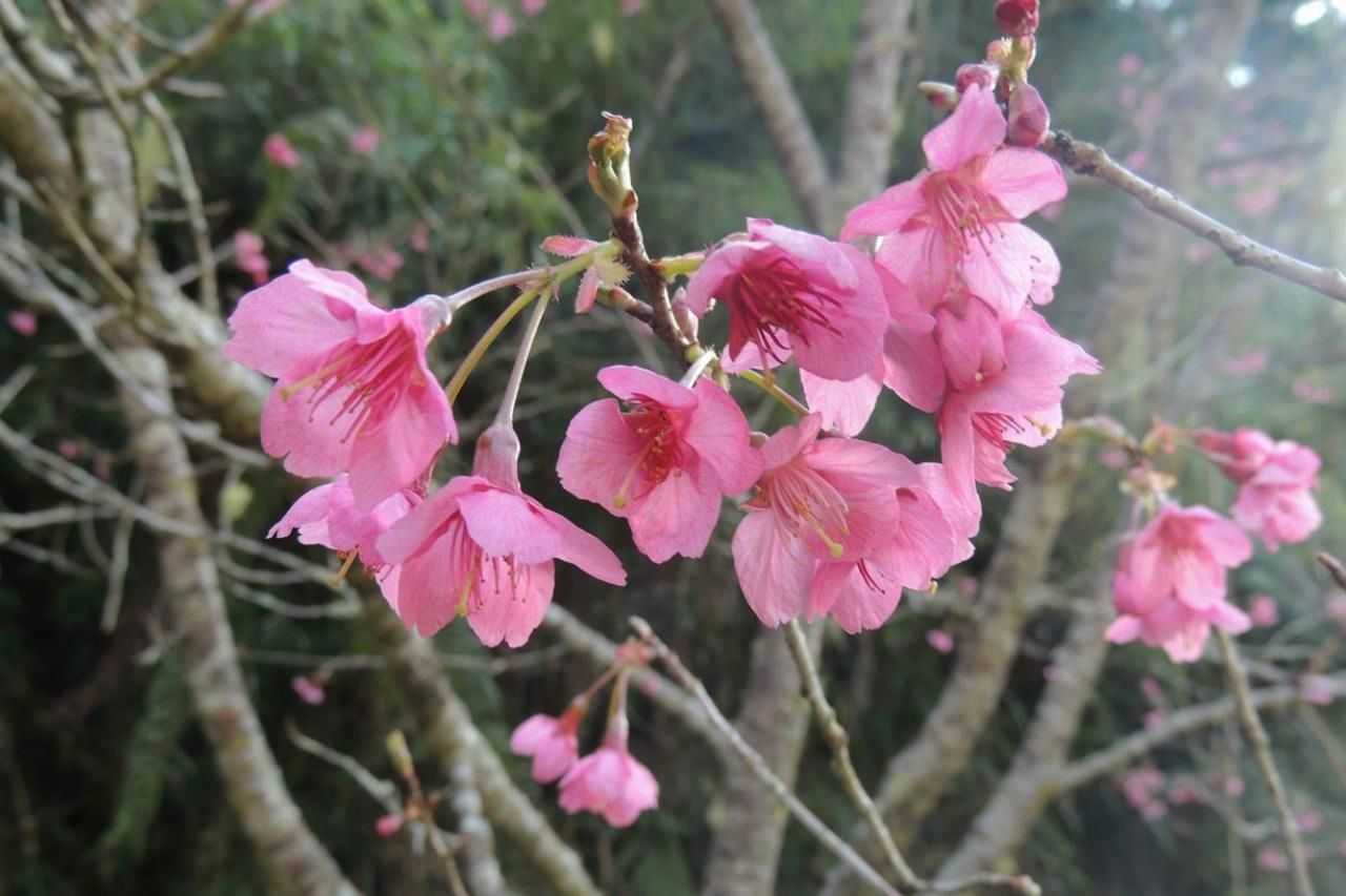 【台灣山櫻花】又稱緋寒櫻,為台灣原生種,色緋紅、單瓣、吊鐘形,花冠含蜜汁,果實成熟時呈豔紅色。 |